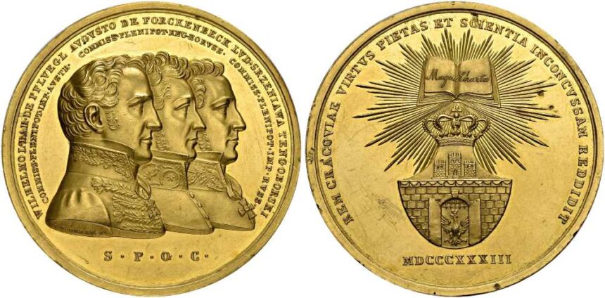 « La Pologne n’est pas encore perdue, tant que nous vivons. Ce que la supériorité étrangère nous a pris, nous le reprendrons par l’épée. » Les Polonais chantent ces paroles chaque fois qu’ils entonnent leur hymne national. Elles leur rappellent leur histoire : après le Congrès de Vienne, la nation polonaise n’existait plus que dans l’esprit de ses citoyens. Cela a donné lieu à de nombreux soulèvements, petits et grands, contre les puissances occupantes. Dans la plupart des cas, ceux-ci ont aggravé la situation de la population civile. Ce fut également le cas en mai 1833, lorsque des guérilleros ont donné aux occupants de Cracovie un prétexte bienvenu pour imposer une nouvelle constitution à la ville. Une médaille d’or de la 100e vente aux enchères SINCONA, dont il ne reste qu’un seul exemplaire, en est le souvenir. Elle sera mise aux enchères à Zurich le 30 octobre 2025.