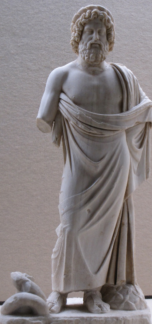 À sa droite, on voit Asclépios avec son bâton enroulé d’un serpent. Mais qu’est-ce que c’est sur son pied ? Est-ce un ballon ? Asclépios jouait-il au football ?