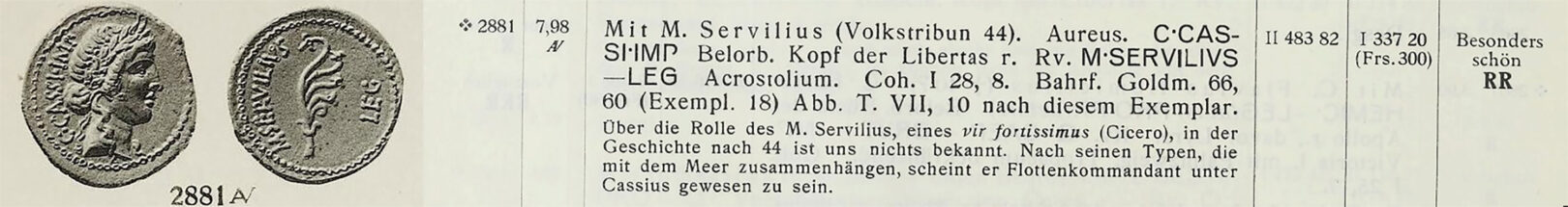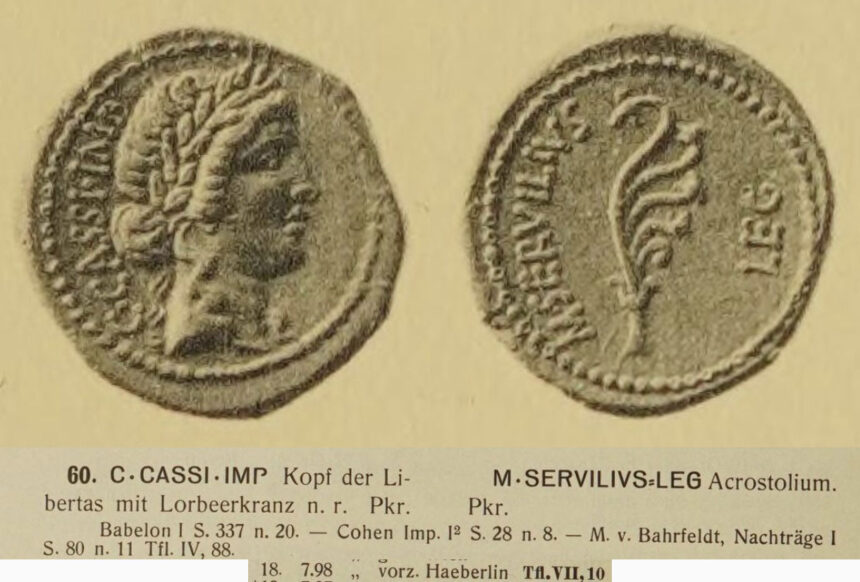Alors qu’il était en possession de Haeberlin, l’aureus de Cassius est passé entre les mains du Dr Max von Bahrfeldt, qui a publié la pièce comme seul exemplaire plaqué de ce type dans son ouvrage de référence de 1923, Die römische Goldmünzenprägung während der Republik und unter Augustus.