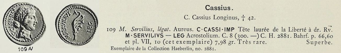 L’aureus Cassius a ensuite rejoint la collection du célèbre numismate allemand Ernst Julius Haeberlin (1847-1925), expert en monnaie républicaine romaine et auteur de l’ouvrage majeur Aes Grave, das Schwergeld Roms und Mittelitaliens, publié en 1910.