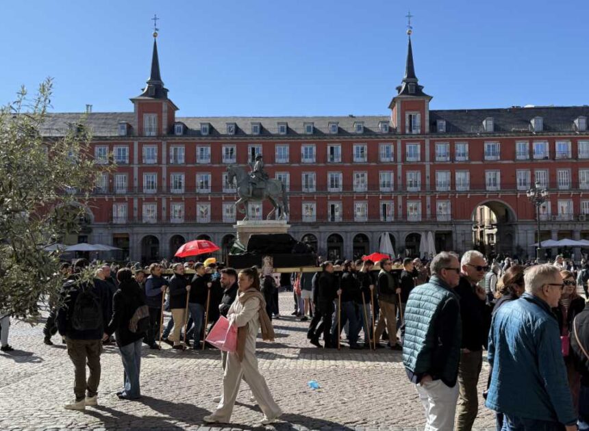 Si j’avais su quelle atmosphère unique règne au Mercado de Monedas y Sellos, je serais venu bien plus tôt. C’était incroyable. Les marchands installaient leurs étals dès 9 h du matin — une heure plutôt inhabituelle en Espagne. Dimanche, nous nous sommes donc promenés dans les rues et ruelles relativement calmes. Tout ce que nous entendions, c’était un martèlement régulier, comme si de nombreuses personnes frappaient le sol en même temps. Le mystère a été rapidement élucidé. De grands groupes d’hommes vêtus de noir portaient d’énormes plates-formes en bois sur leur dos. Ils se déplaçaient à l’unisson, en rythme avec leurs bâtons. Il s’agissait de confréries s’entraînant pour la Semana Santa. Elles participent aux processions traditionnelles pendant la Semaine Sainte, lorsque des scènes du récit biblique sont mises en scène sur les plates-formes, qui sont encore vides à ce stade.